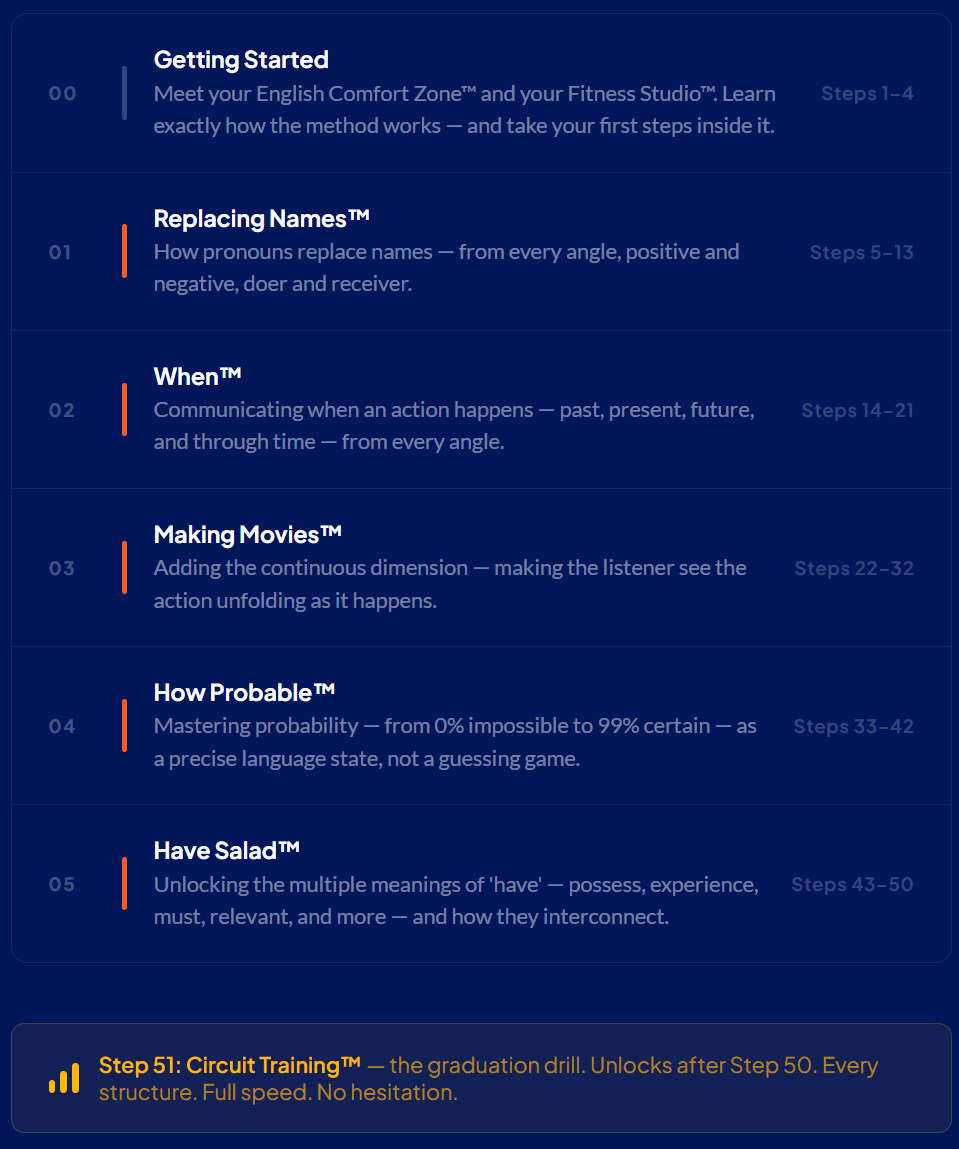 Better English does the opposite of what school taught you. Your grammatical engine — The Motor — is the mechanical foundation every fluent speaker runs on, but most adults never built it properly. The Harmsen Step Method™ is a 50 step English mastery system that moves you from translating in your head to thinking and speaking in English — naturally.